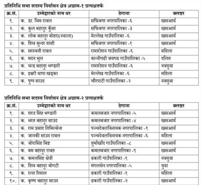 साँफेबगर – नेपाली कम्युनिस्ट पाटी अछामले प्रतिनिधि सभाको लागि चौरपाटी गाउँपालिकाका पुस्प कुमार साउद लाई सिफारिस गरेको छ ।