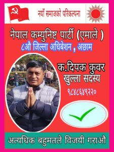 नेकपा (एमाले) अछामको खुला सदस्यमा सा न पा ९ बुढाकोट निवासी दिपक कुँवरले उम्मेद्वारी दर्ता गराउनु भएको छ । ब्यापारबाट राजनीतिमा प्रवेश गर्नुभएका नेता कुवर सहयोगी, निष्ठावान र दृढताका साथमा जिम्मेवारी पूरा गर्ने व्यक्तिका रुपमा चिनिनुहुन्छ । हरेक कार्यकर्ताको निर्णयका आधारमा आफू अघि बढ्ने भएकोले सामुहिकतामै एकता देखेकोले पार्टीलाई बलियो