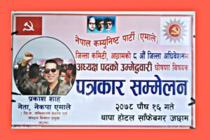 साफेबगर:नेपाल कम्युनिस्ट पार्टी (एमाले )जिल्ला कमिटी अछामको ८औं जिल्ला अधिबेशनमा अध्यक्ष पदको उम्मेदवारी घोषणा गर्नुभएको छ ।नेकपाका नेता , जिल्ला कमिटी सचिवालय सदस्य एवं संगठन बिभाग प्रमुख प्रकाश शाहले पत्रकार सम्मेलनको आयोजना गरि आफ्नो उम्मेदवारी घोषणा गर्नुभएको हो । नेता शाहले बुढीगङ्गा नगरपालिका बार्हबिस बाजुरामा रहेको त्रिशक्ति मा .वि बाट