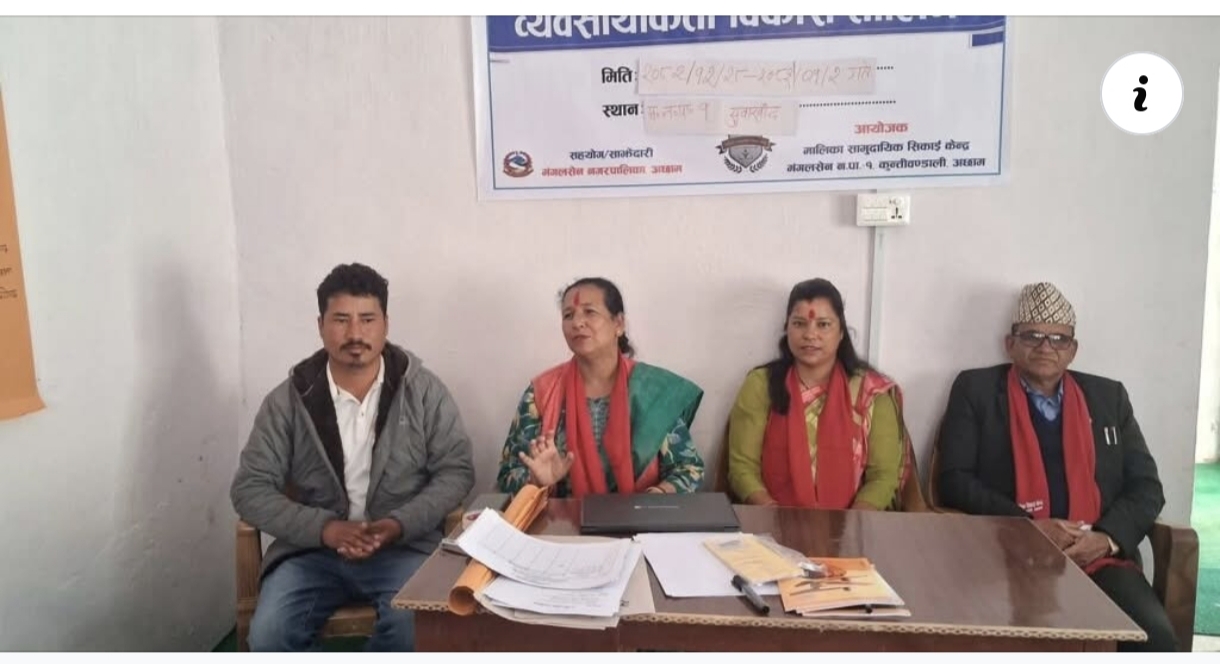 मंगलसेन नगरपालिका–१ मा बहुविपन्न तथा सीमान्तकृत महिलाहरूको आयआर्जन र सीप विकास गर्ने उद्देश्यले व्यवसायिकता विकास तालिम सञ्चालन गरिएको छ। मालिका सामुदायिक सिकाइ केन्द्रको आयोजना तथा मंगलसेन नगरपालिकाको सहयोग र साझेदारीमा उक्त तालिम सुरु गरिएको हो। सिकाइ केन्द्रका अध्यक्ष होम बहादुर साउदको अध्यक्षतामा सम्पन्न उद्घाटन कार्यक्रममा मंगलसेन नगरपालिकाका उपप्रमुख संगिता कुमारी