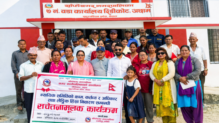 साँफेबगर । न्यायीक समितिको काम, कर्तव्य र अधिकार तथा लैंगिक हिंसा निवारण सम्बन्धी एक दिने सचेतनामूलक कार्यक्रम रिडिकोटमा सम्पन्न भएको छ। साँफेबगर नगरपालिका न्यायीक समितिको