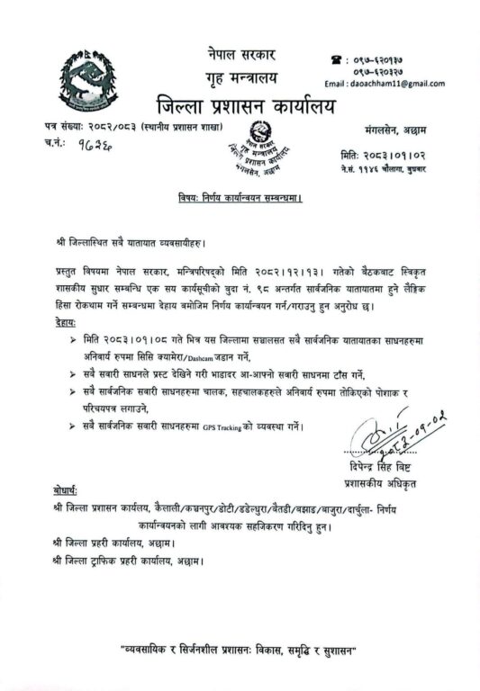 अछाम । जिल्ला प्रशासन कार्यालय अछामले जिल्लाभित्र सञ्चालन हुने सबै सार्वजनिक यातायातका साधनमा CCTV (ड्यासक्याम) जडान अनिवार्य गरेको छ। मन्त्रिपरिषद्को निर्णयअनुसार प्रशासनले यस्तो व्यवस्था लागू गर्न निर्देशन दिएको हो।
