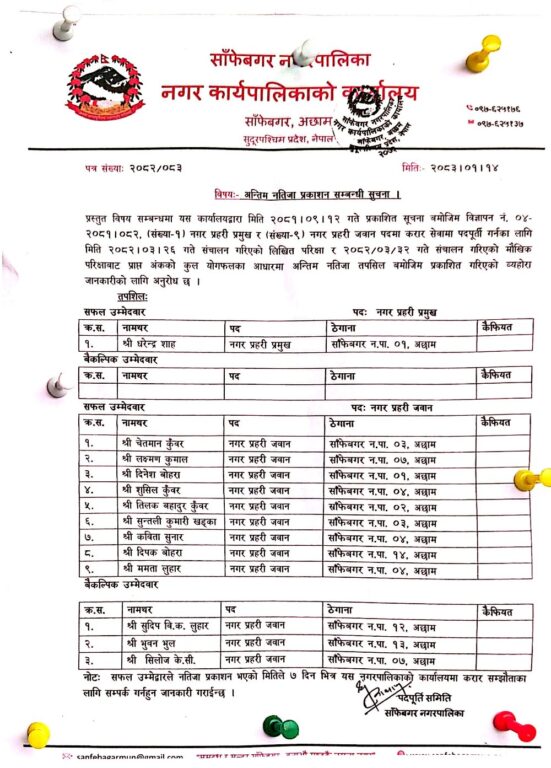 साँफेबगर नगरपालिकामा नगर प्रहरी भर्नाको अन्तिम नतिजा सार्वजनिक