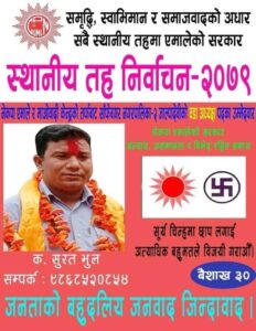 साफेबगर – नेकपा एकीकृत समाजवादी र नेपाली काङ्ग्रेसको चुनावी आमसभा तथा पार्टी प्रबेश कार्यक्रम साफेबगर नगरपालिका ९ बुढाकोटमा सम्पन्न भएको छ । धुर्ब बहादुर थापाको अध्यक्षतामा भएको चुनावी आम सभामा एकीकृत समाजवादी केन्द्रिय सदस्य एवं अछाम इन्चार्ज कुल बहादुर कुवर, प्रमुख अतिथि रहनु भएको थियो । नेकपा एस केन्द्रिय सदस्य