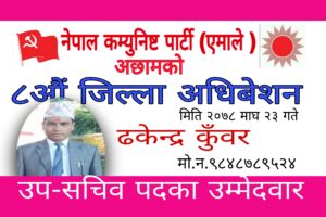 नेपाल कम्युनिस्ट पार्टी (एमाले) जिल्ला कमिटी अछामको ८ औं जिल्ला अधिबेशन यही पौष २३ गते सम्पन्न हुने भएको छ् । जिल्ला अधिबेशनमा युवा नेता ढकेन्द्र कुवरले उप सचिव पदमा आफ्नो उम्मेदवारी घोषणा गर्नुभएको छ ।नेता कुवर लामाे समय देखि नेकपा एमालेकाे सिपाईभई २०४६ सालकाे जनअान्दाेल संगै २०४८सालकाे अनेरास्ववियु प्रारम्भिक कमिटिकाे
