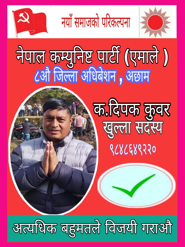 नेकपा (एमाले) अछामको खुला सदस्यमा सा न पा ९ बुढाकोट निवासी दिपक कुँवरले उम्मेद्वारी दर्ता गराउनु भएको छ । ब्यापारबाट राजनीतिमा प्रवेश गर्नुभएका नेता द्वय सहयोगी, निष्ठावान र दृढताका साथमा जिम्मेवारी पूरा गर्ने व्यक्तिका रुपमा चिनिनुहुन्छ । हरेक कार्यकर्ताको निर्णयका आधारमा आफू अघि बढ्ने भएकोले सामुहिकतामै एकता देखेकोले पार्टीलाई बलियो