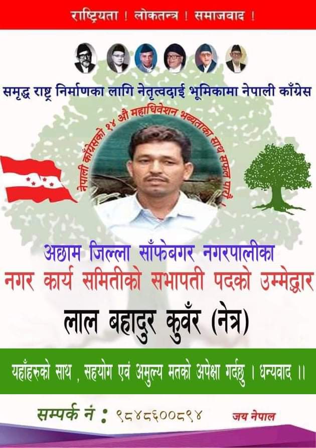 अछाम :नेपाली काँग्रेसका युवा नेता लालबहादुर कुँवर (नेत्र )ले साँफेबगर नगर सभापतिकाे उमेदवारमा घोषणा गर्नुभएको छ । भदौ २७ गते हुने नगर अधिवेशनमा आफू सभापतिको लागि उम्मेद्धारी दिने तयारी रहेकाे युवा नेता लालबहादुर कुँवरले बताए । उहाँले भन्नुभयाे, अाफु कुनै गुट र उपगुट लाई सहयोग नगरी नेपाली काङ्ग्रेस लाई बलियो